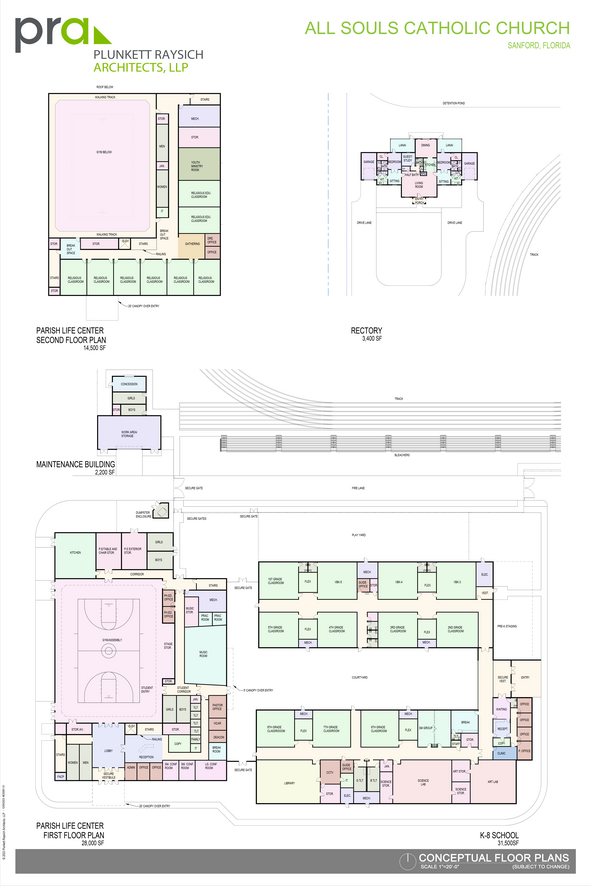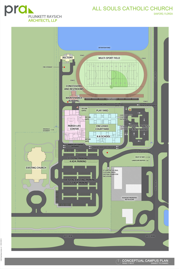 This is the new "Master Plan" for building out our campus on SR 46. During our parish synod, overwhelming support was shared for the construction of a parish hall and parochial school at our new location. Because our property is so limited after the Diocese sold property to CONDEV, Fr. Jeremiah wanted a formal site plan that envisioned all that we would like to see, but made sure that it met all the architectural and civil engineering constraints for our post-sale property size.